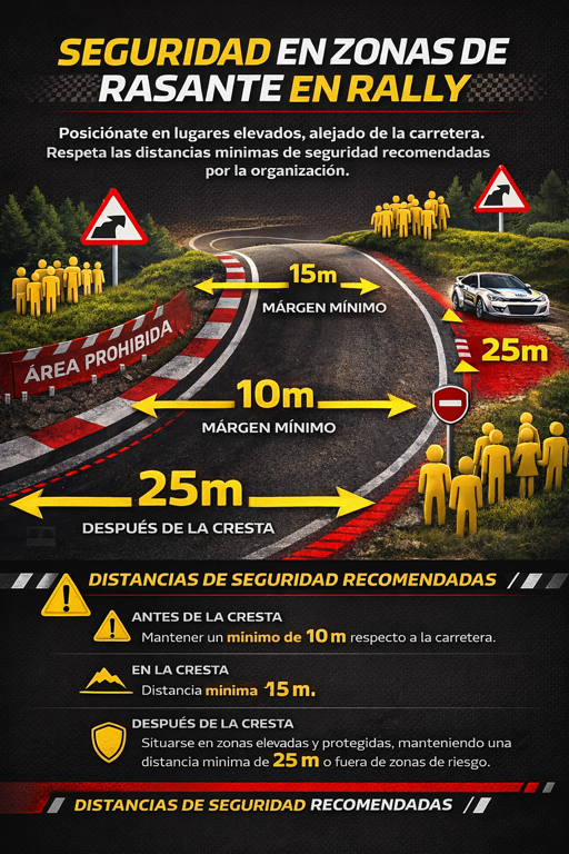 Durante el desarrollo de la prueba, el público debe permanecer siempre en su ubicación, sin invadir la calzada ni desplazarse entre zonas. Es fundamental seguir las indicaciones de los comisarios y mantenerse atento en todo momento al paso de los vehículos.
