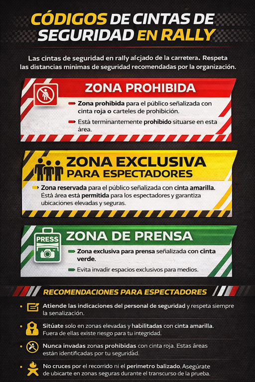 El rally es un evento emocionante que se desarrolla en vías abiertas al entorno natural. Para garantizar la seguridad de todos los asistentes, la organización establece un sistema de señalización mediante cintas de colores que delimitan las zonas permitidas y restringidas.